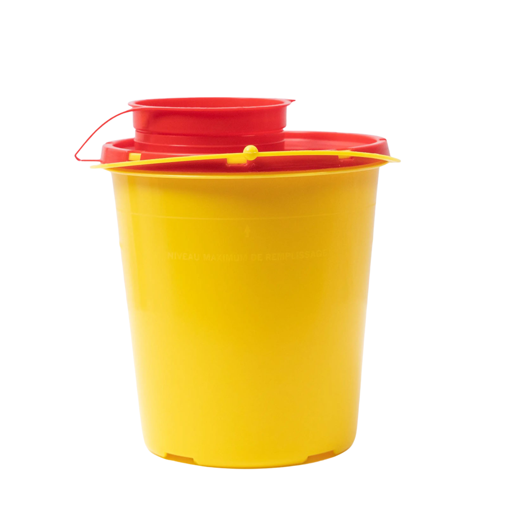 The cannula disposal box is made of a combination of copolymer and polypropylene materials, which results in distinguished product properties. The cylindrical shape of the cannula disposal box sits comfortably in the hand. The lid can securely seal the contents in the cannula disposal box.